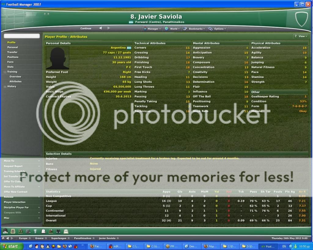 Πολλοί από εσάς πιθανόν θα έχετε σκεφτεί ότι το Football Manager σας κλέβει, έστω και λίγο. Μετά από την εμπειρία μου στο Football Manager 2007, το οποίο και σταμάτησα πλέον να παίζω, κατάλαβα ότι κάτι τέτοιο δεν ισχύει σε καμία περίπτωση. Εκείνη η έκδοση ήταν πραγματικά ένα παιχνίδι της υπομονής. Από το 2006 έπρεπε να φτάσω στο 2011 για να κατακτήσω επιτέλους το Champions League με τον Παναθηναϊκό. Ως manager που σέβεται τον εαυτό του δεν είχα κάνει κανένα restart, έστω κι αν την αμέσως προηγούμενη χρονιά είχα χάσει στον τελικό από την Arsenal με το ταπεινωτικό 4-1. Στο παρακάτω story μπορείτε αν θέλετε να κάνετε κλικ στις εικόνες για μεγέθυνση. Ξεκινάμε με ένα δείγμα των τραυματισμών στο FM 2007. Αυτα είναι τα μόνα σημεία του παιχνιδιού που θέλουν το restart τους (γιατί λόγω bug είναι κρίμα να παίζετε με μισή εντεκάδα). Απολαύστε...