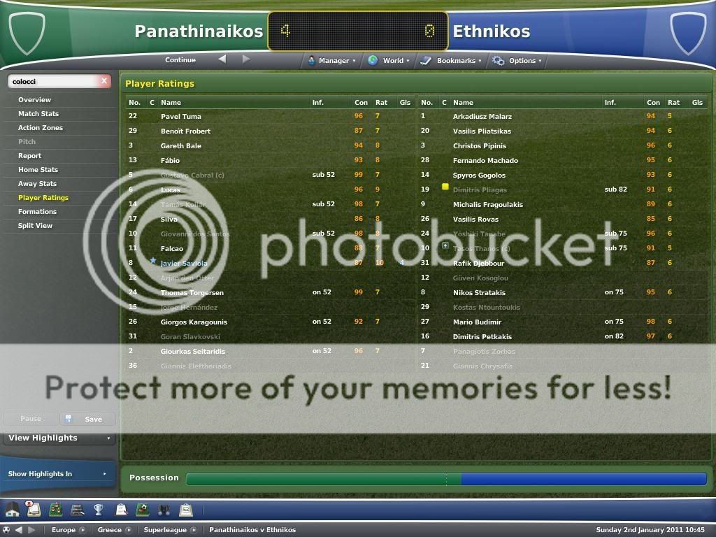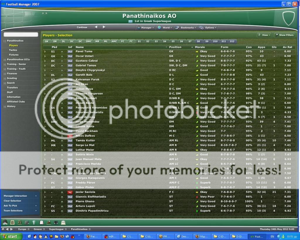 Επειδή λοιπόν των φρονίμων τα παιδιά πριν πεινάσουν μαγειρεύουν, έτσι κι εγώ φρόντισα να αποκτήσω με το καλημέρα παικταράδες όπως: Marcelo Grohe (GK), Gareth Bale (DL), Gabriel Tamas (DC), Silva (DC), Gustavo Cabral (DC), Lucas (DMC), Jorge Hernandez (DM C), Sergio Mota (AM LC), Juan Manuel Mata (AM LC), Francisco Merida (AM LC), Giovanni Dos Santos (AM C), Vincent Acapandie (ST) και αργότερα τον τρισμέγιστο Javier Saviola (FC) ο οποίος κυριολεκτικά δεν ήξερε τι έκανε μέσα στο γήπεδο! Πάντως έστω και virtualy, έκανα το όνειρό μου πραγματικότητα να τον ντύσω πράσινο γιατί ήταν κάτι που το είχα απωθημένο. Όλα αυτά τα χρόνια έχουμε δει Giovaniδες, Diogους και λοιπούς βιρτουόζους της μπάλας να ντύνονται ερυθρόλευκα και το μόνο που είχαμε να αντιπαρατάξουμε ως απάντηση ήταν ο Gilberto Silva. Ε γι' αυτό λοιπόν υπάρχει το FM. Για να βγάζουμε τα απωθημένα που έχουμε εμείς οι φίλαθλοι μέσα μας.