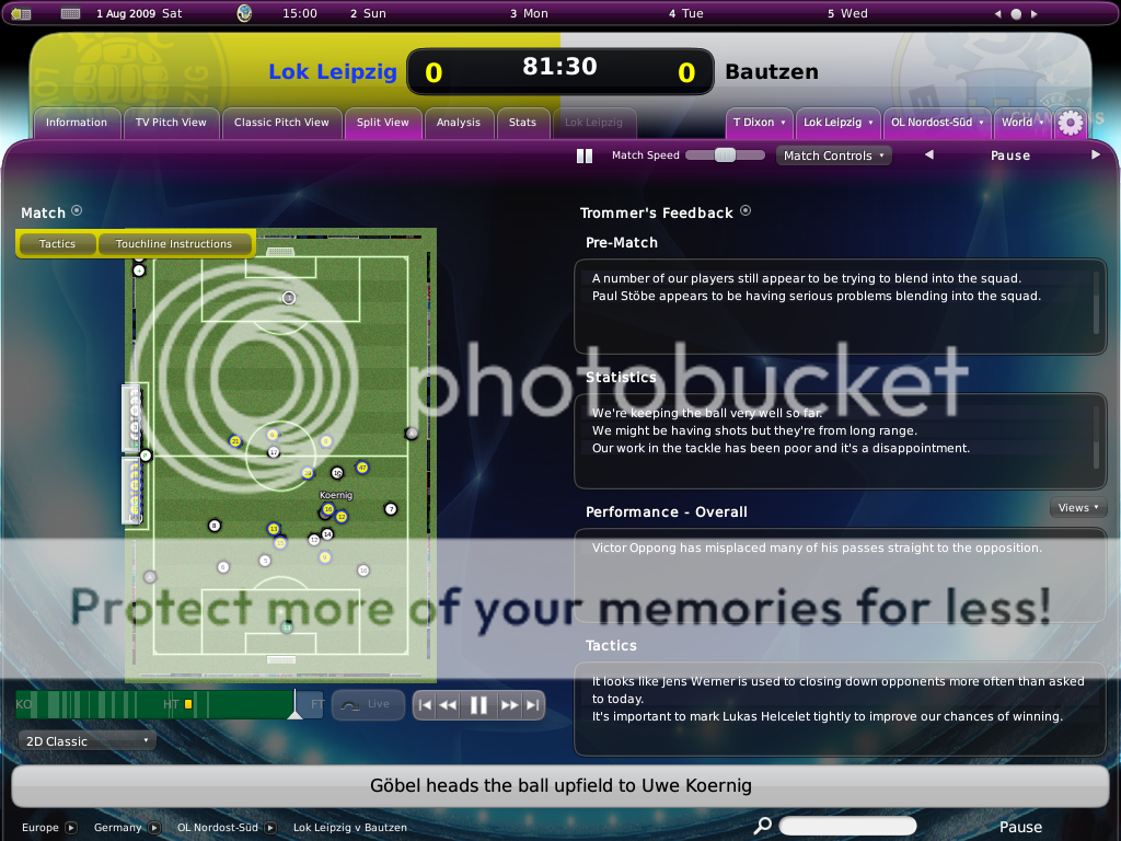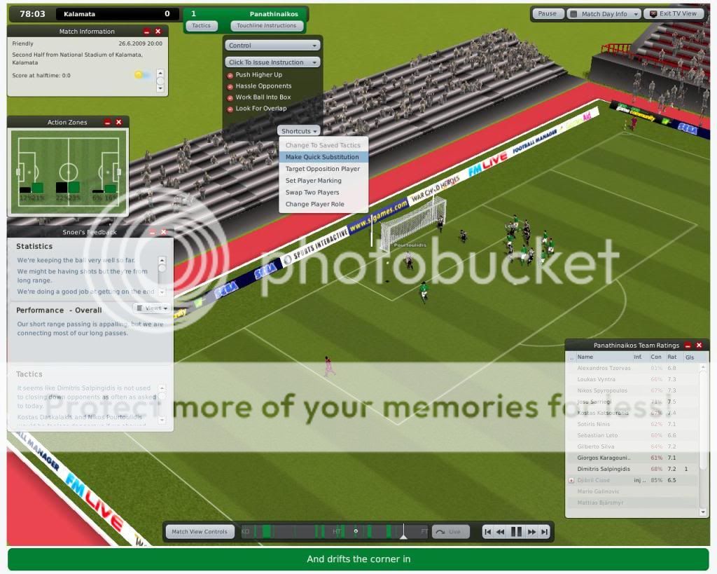 Για να κάνετε μια γρήγορη αλλαγή την ώρα του παιχνιδιού, χρησιμοποιήστε το μενού “Touchline Instructions” κάτω από το όνομα της ομάδας σας. Αυτό σας επιτρέπει να ορίσετε μέσα σε δευτερόλεπτα, το αν οι παίκτες σας θα παίξουν άμυνα, κατοχή ή επίθεση, αν θα πιέζουν τον αντίπαλο, αν θα παίζουν από τον άξονα ή τα πλάγια, πως θα πασάρουν κτλ. Για τις εξειδικευμένες τακτικές, επιλέξτε το μενού “Tactics”. Αν θέλετε μπορείτε οποιαδήποτε στιγμή να πατήσετε παύση για να δείτε με την ησυχία σας τι αλλαγές θέλετε να κάνετε και τι οδηγίες θα δώσετε στους παίκτες σας. Μην ξεχνάτε επίσης να ελέγχετε τις οθόνες Stats και Analysis για να έχετε μια σαφέστερη εικόνα του αγώνα και της απόδοσης των παικτών σας.