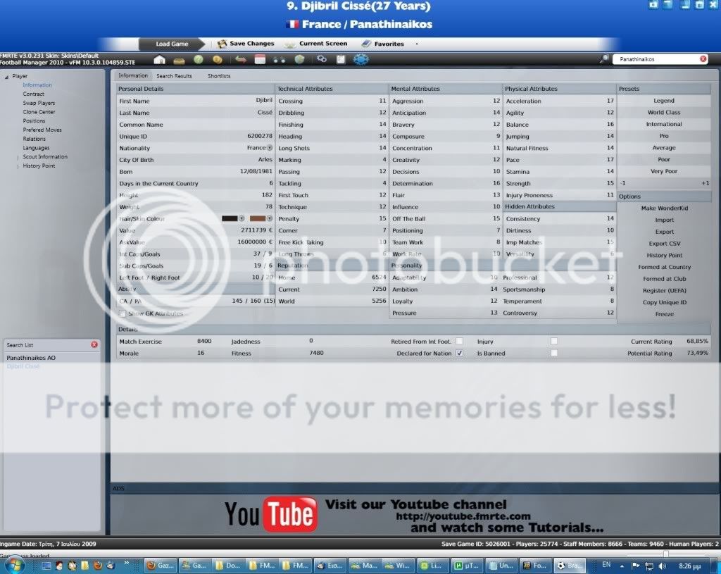 άγκη να ξεκινήσετε νέο παιχνίδι, ο Real Time Editor λειτουργεί και με τα παλιά saves). Αφού κάνετε Load Game μέσα στο Football Manager 2010, τρέξτε τον editor και επιλέξτε κι εκεί Load Game. Στη συνέχεια μπορείτε να ξεκινήσετε να τον λειτουργείτε. Πριν κάνετε οποιαδήποτε αλλαγή στο save σας, κρατήστε κι ένα backup του αρχείου σας για παν ενδεχόμενο.Για να δείτε τα χαρακτηριστικά ενός παίκτη και (αν θέλετε) να τα αλλάξετε απλά γράψτε το όνομα του παίκτη στην αναζήτηση και μετά κάντε κλικ πάνω του. Στη συνέχεια, κάνοντας κλικ σε κάποιο χαρακτηριστικό, μπορείτε να του αλλάξετε την τιμή. Πέρα από την βασική καρτέλα κάθε παίκτη, στα αριστερά της οθόνης έχετε πρόσβαση και σε πολλά άλλα ενδιαφέροντα καλούδια, τα οποία είναι τα εξής: