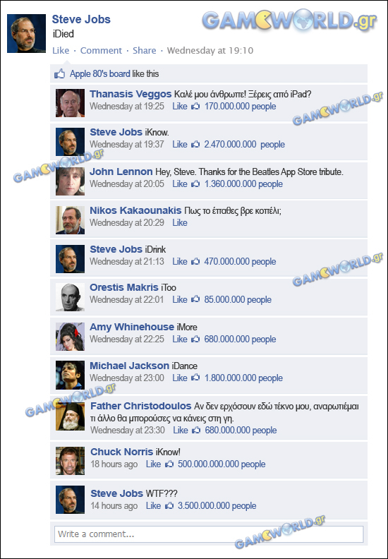Με αφορμή το γεγονός αυτό, οι Users ξεκινούν από σήμερα μία ακόμα ενότητα στη στήλη Users. Αυτή των Facebook profiles. Η αρχή γίνεται με το profile του Steve Jobs, το οποίο αφιερώνουμε σε όλους όσους δεν είναι ανάμεσά μας. Καθότι οι Users κάνουν ρεπορτάζ...μέχρι και στον παράδεισο.