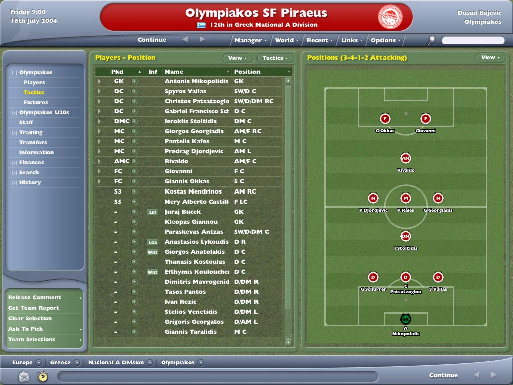Κ.Β.: Εγώ στο CM έπαιζα ένα 3-1-3-1-2, που μου το είχε δείξει ο Γιάννης και πήγαινε πάρα πολύ καλά. Το ψιλοδοκίμασα και στο Football Manager και τελικά κατέληξα σε ένα 3-1-4-2. Δηλαδή δεν βάζω επιτελικό μέσο (AM C) γιατί δεν μου παίζει ποτέ καλά. Στο Football Manager την προπόνηση την αφήνω ως έχει γιατί είναι πολύ μπερδεμένη. Παλιότερα στο CM τους βάζαμε λίγο απ' όλα.