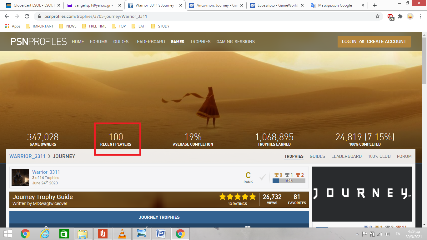 Πιστεύω πως τα multiplayer trophies του Journey μπορώ να τα αποκτήσω χωρίς PS Plus γιατί είδα πως έχω αποκτήσει το Wonder.Ωραίο παιχνίδι ήταν.Το τερμάτισα δύο φορές.Θα πήγαινα για το 100 % αλλά κάποια trophies απαιτούν multiplayer και δεν έχω PS Plus.