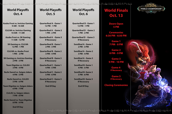 Τα playoffs θα διαρκέσουν τρεις ημέρες, 4-6 Οκτωβρίου, αλλά ο μεγάλος τελικός θα διεξαχθεί μέσω ενός ειδικού event στις 13 Οκτωβρίου. Εάν θέλετε, μπορείτε να δείτε αρκετές από τις αγαπημένες σας ομάδες (Team SoloMid, CLG Prime, Dignitas, Moscow 5, SK Gaming, Azubu Frost) να αγωνίζονται για την μάχη της πρώτης θέσης από εδώ. Αν θέλετε να μάθετε πως έφτασαν στους τελικούς μερικές από τις παραπάνω ομάδες μπορείτε να διαβάσετε τα σχετικά άρθρα εδώ και εδώ.