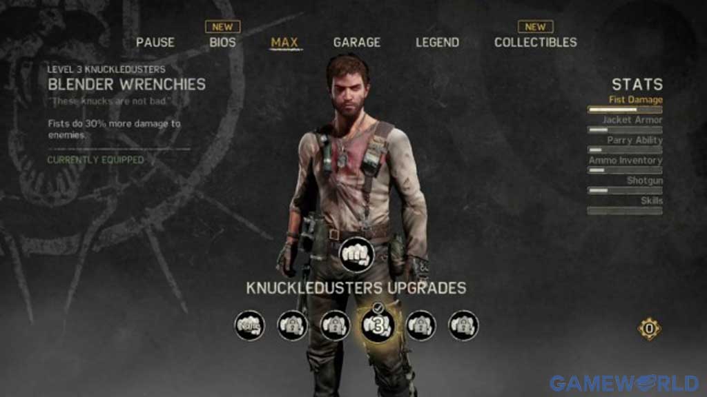 Αξίζει να σημειώσουμε εδώ πως προφανώς υπάρχουν και τα ανάλογα RPG στοιχεία, με την μορφή αναβαθμίσεων στον εξοπλισμό του Max, στην εμφάνισή του, στις κινήσεις που κάνει κατά την μάχη αλλά και στα attributes του όπως health, αντοχή, ισχύ χτυπημάτων κλπ. Για τις πρώτες θα χρειαστείτε όπως συμβαίνει και στα οχήματα scrap metal (για κάποιο λόγο), ενώ για τις δεύτερες θα πρέπει να συναντήσετε έναν μυστηριώδη τύπο που σας «χαρίζει» τις αναβαθμίσεις, παρόλο που μερικές από αυτές είναι κάπως άσχετες με το μυστικιστικό αυτό στυλ, όπως η ικανότητα να βρίσκετε περισσότερο νερό στις διάφορες πηγές.