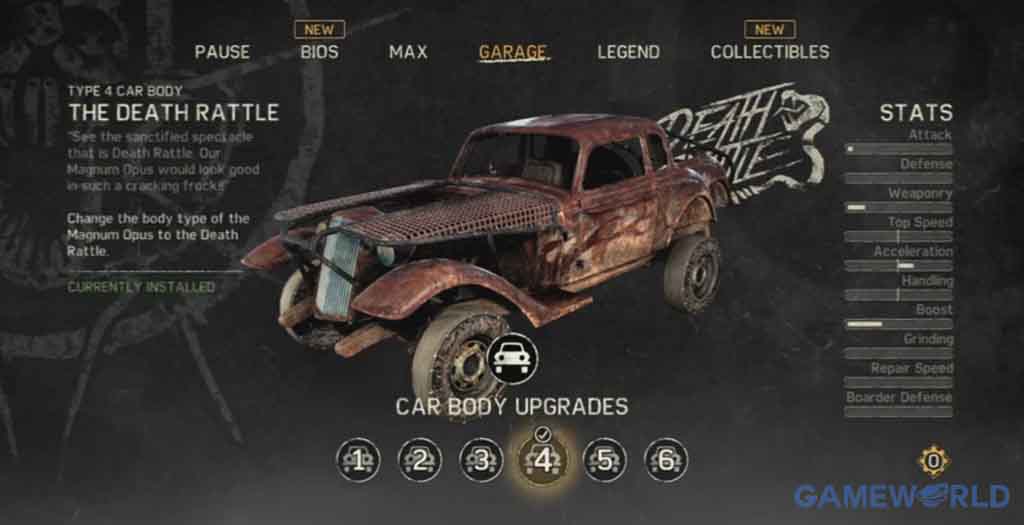 Φυσικά όσο αναβαθμίζετε το όχημά σας κερδίζετε σε επιδόσεις, αν και μπορεί να χάνετε κάπου άλλου, δηλαδή πχ. με αναβάθμιση κινητήρα έχετε την δυνατότητα να γκαζώνετε «τρελά» αλλά χάνετε σε κρατήματα. Τα upgrades γίνονται μέσα από το κεντρικό μενού και την υποκατηγορία garage, μια οθόνη που είναι διαθέσιμη ανά πάσα στιγμή. Για να κάνετε τις αναβαθμίσεις θα πρέπει να έχετε ξεκλειδώσει μέσω της προόδου σας κάποιο upgrade και ταυτόχρονα να έχετε την απαραίτητη ποσότητα scrap metal, που είναι το «συνάλλαγμα» του παιχνιδιού, για το οποίο θα τα πούμε και στη συνέχεια. Ενδεικτικά αναφέρουμε πως μπορείτε να «φτιάξετε» το όχημά σας όσον αφορά πχ. την μηχανή, τα ελαστικά, τις αναρτήσεις, το σασί, το χρώμα του -αλλά και τον οπλισμό του, μεταξύ άλλων.