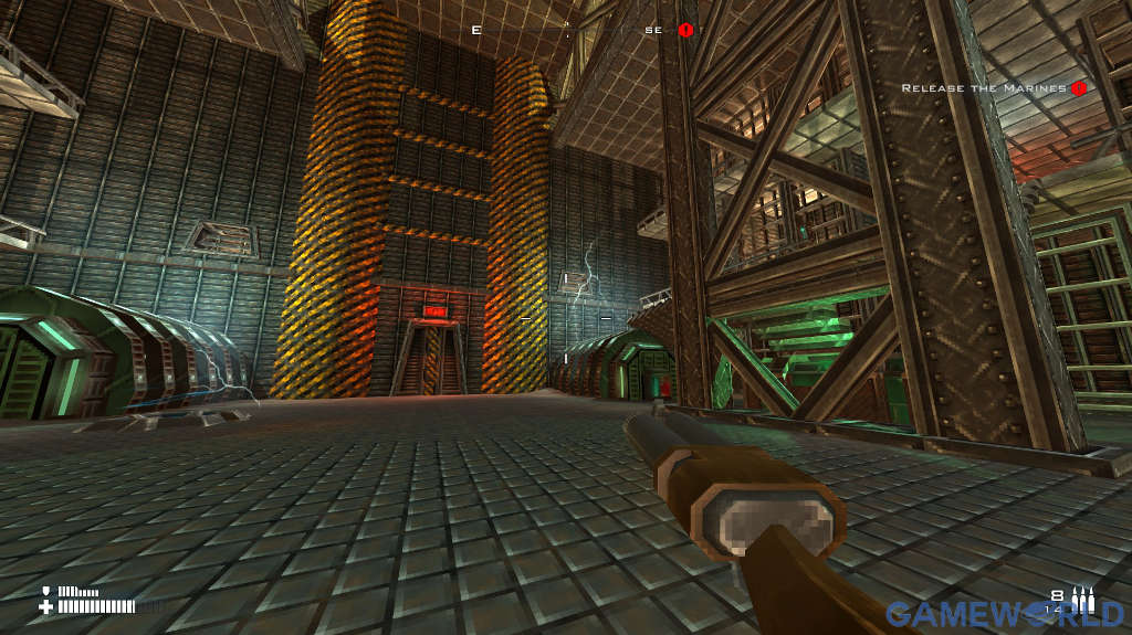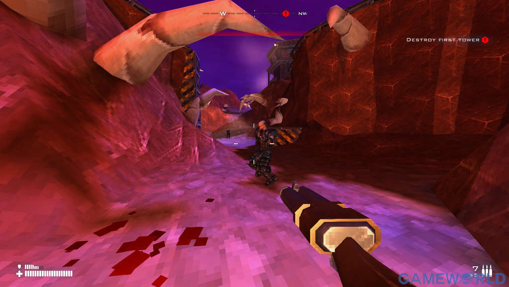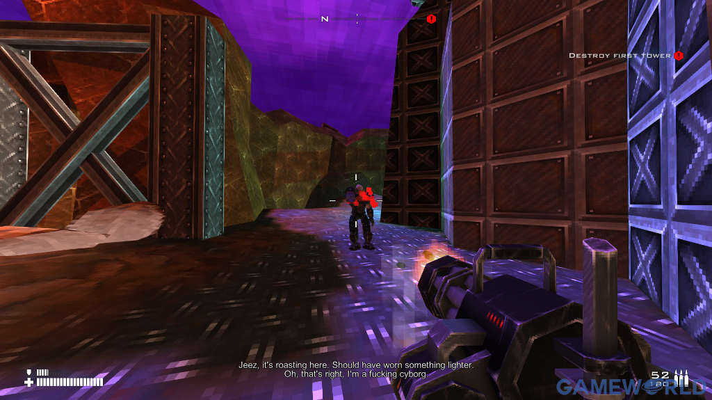 Ξεκινώντας, το πρώτο level θα σας θυμίσει έντονα τον κόσμο του Quake II. Θα δείτε πιξελιασμένα textures, το φωτισμό να είναι ένα κράμα από Quake II και το πρώτο Unreal Tournament, ενώ όλα εκτυλίσσονται σε ένα εξωγήινο "μεταλλικό" περιβάλλον. Μια γυναίκα cyborg, η Athena (όπως προτιμάει να συστήνεται η ηρωίδα μας) και πολεμάτε αντιπάλους οι οποίοι αποτελούν μια "απομίμηση" των Stroggs. Φυσικά το όνομα Athena δεν είναι τυχαίο, καθώς όπως εξηγεί η ηρωίδα, αποτελεί ένα από τα default skins του Quake II. Γενικά η ατμόσφαιρα φροντίζει να αποδώσει την αίσθηση των πρώτων Quake, με έντονο bobbing στην κίνηση του όπλου, υπερφυσικά άλματα, θολά και χοντροκομμένα όπλα και πιξελιασμένα εφέ εκρήξεων και αίματος. Ένα level θα σας θυμίσει έντονα Unreal Tournament ή Quake 3 Arena, με rocket jumps, μηδαμινή βαρύτητα, προσπαθώντας να φτάσετε τον αριθμό frags που απαιτείται για να κερδίσετε.