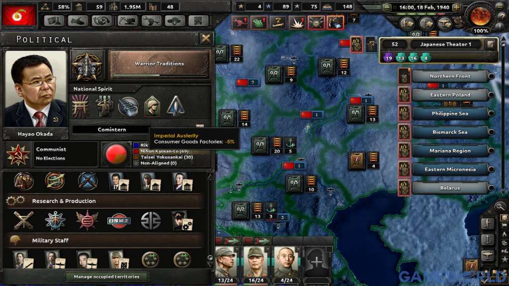 Αντικρίζοντας τα προαναφερθέντα και διαβάζοντας αποφθέγματα από όλους τους ηγέτες του πολέμου την ώρα του loading θα σχηματίσετε την εντύπωση ότι η Paradox κρατά ίσες αποστάσεις από τους αντίπαλους συνασπισμούς και δεν μεροληπτεί υπέρ κανενός. Φανταστείτε την έκπληξη μου λοιπόν όταν έγινα μάρτυρας του παρακάτω γεγονότος. Διοικώντας την ιαπωνική αυτοκρατορία, γύρισα το πολίτευμα στον κομμουνισμό, έγινα μέλος της Comintern και έστειλα γύρω στις 20 μεραρχίες να διασχίσουν την Σοβιετική Ένωση και να σταθούν στα σύνορα με την Φινλανδία. Εκεί περίμενα υπομονετικά μέχρι το ξέσπασμα του ρωσο-φινλανδικού πολέμου στις 30 Νοεμβρίου του 1939 για να βοηθήσω τους συμμάχους μου. Η ημερομηνία έφτασε, πέρασε και η Σοβιετική Ένωση δεν κήρυξε ποτέ τον πόλεμο στην Φινλανδία όπως συνέβη ιστορικά! Αναρωτιέται κανείς αν η εξαφάνιση του ρώσο-φινλανδικού πολέμου οφείλεται στην ανεπάρκεια των ιστορικών γνώσεων των προγραμματιστών ή σε μια προσπάθεια να ξεχαστεί η επιθετικότητα των σοβιετικών, καθαγιασμού δηλαδή των πολιτικών τους επιλογών.
