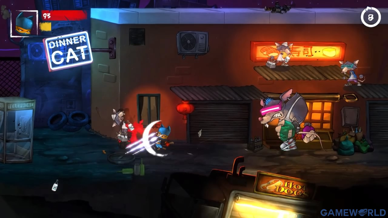 Πιέζοντας το special button στον αέρα φτάνει η ώρα των πολλών... Ρίχτερ. Ο χαρακτήρας μας επέστρεψε με μανία στο έδαφος, το κοπάνησε με την γροθιά του και δημιούργησε σεισμό που τίναξε σαν κούκλες τα ταλαίπωρα όντα που δοκίμασαν την δόνηση. Το earthquake που μόλις περιγράψαμε είναι το ιδανικό χτύπημα για να σκορπίσουμε τους εχθρούς όταν είμαστε περικυκλωμένοι. Είναι επίσης το μοναδικό που “τελειώνει” αμέσως όσους αντιπάλους μπορούν να μπλοκάρουν τα υπόλοιπα χτυπήματά μας, καλή ώρα οι αστυνομικοί σκύλοι με τις ασπίδες τους. Στην συνέχεια, το αγαπημένο πιάτο των γατών γίνεται φονικό εργαλείο στα χέρια της γάτας μας. Πιέζοντας το σχετικό button, η ψιψίνα – νίντζα πετάει ψάρια με ρυθμό πολυβόλου στους εχθρούς. Το damage της μοναδικής ranged επίθεσης είναι αμελητέο αλλά βοηθά στο να κρατάμε τους εχθρούς σε απόσταση ή να τους βομβαρδίζουμε από ψηλό σημείο χωρίς να κινδυνεύσουμε λεπτό.