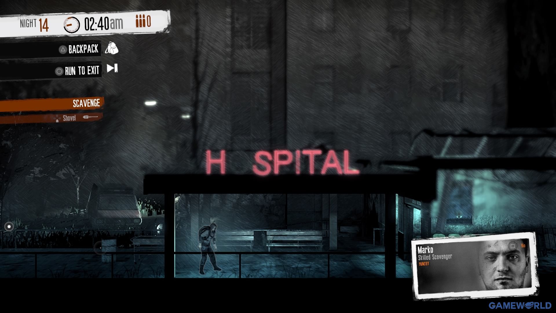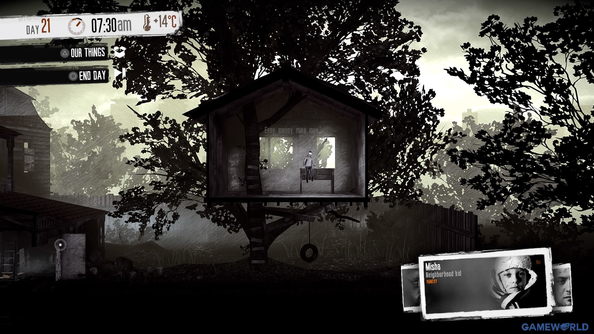 Η καθημερινότητα των αμάχων χωρίζεται σε δυο σκέλη. Αυτό της διαχείρισης των πόρων, κατασκευής αντικειμένων και συσκευών (σόμπες, κρεβάτια, καρέκλες, κουζίνες κτλ.) και ορίζεται από το φως της ημέρας. Το δεύτερο σκέλος αναλώνεται στην απόκτηση προμηθειών και resources μέσω του scavenging σε κοντινές περιοχές κατά τη διάρκεια της νύχτας. Η επανάληψη των ίδιων πράξεων νυχθημερόν μπορεί να αποβεί μονότονη για τον gamer από τη μια, αλλά υπογραμμίζει την προσπάθεια για επιβίωση των χαρακτήρων από την άλλη, εν καιρώ πολέμου. Η ψυχολογία των μελών της ομάδας σας δέχεται κατακόρυφες αυξομειώσεις και συνήθως τείνει προς το ναδίρ. Ο θάνατος ενός μέλους κατά την εξόρμηση για προμήθειες, η κλοπή φαρμάκων από γηραιό ζευγάρι, είναι μόνο δυο από τις συνθήκες οι οποίες κάνουν τους ήρωές μας να αναρωτιούνται για την ηθική αλλά και το νόημα της κατάστασης που βιώνουν. Σε αυτές τις περιπτώσεις η κουβέντα μεταξύ τους, ένα τσιγάρο, λίγο αλκοόλ και η συναναστροφή με τα παιδιά μπορεί να αποδειχθεί σωτήρια για την επιβίωσή τους.