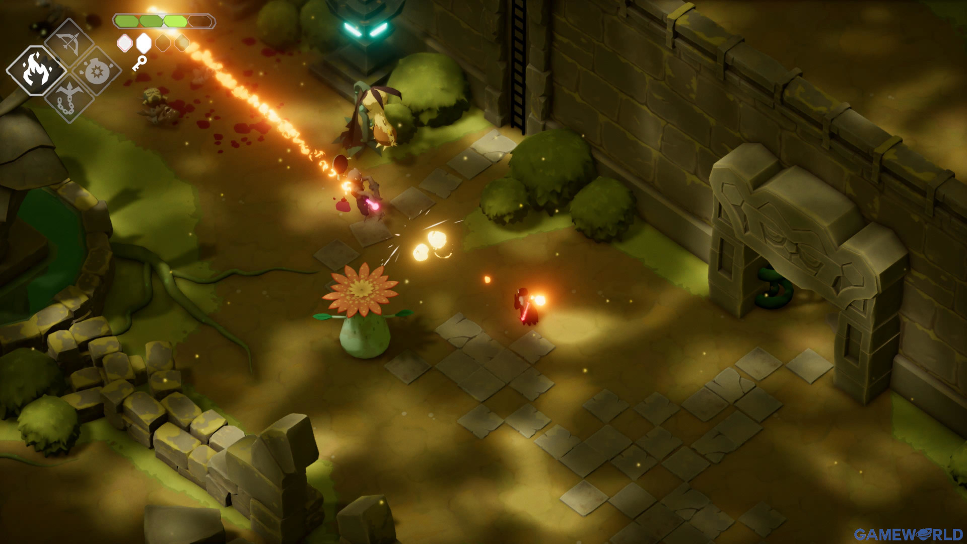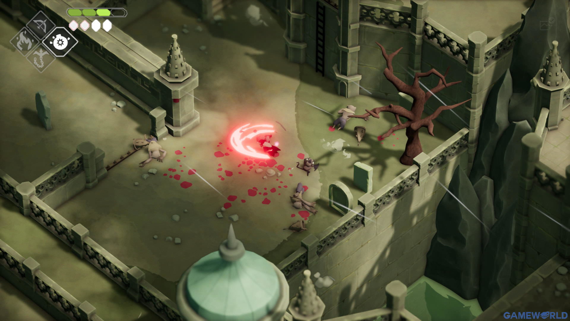 Αρχικά σας όπλα είναι ένα σπαθί και ένα τόξο. Με τα σπαθί κάνετε τα κλασσικά combos τριών hits, ενώ έχετε και κουμπί για dodge, όπου κάνετε την γνωστή κουτρουβάλα. Οι εχθροί, ακόμα και οι πιο απλοί χρειάζονται αρχικά αρκετά χτυπήματα, ενώ και εσείς αντέχετε μέχρι τέσσερα hits πριν πεθάνετε και επιστρέψετε στην αρχή της κάθε πίστας. Έτσι θα πρέπει να μαθαίνετε τα μοτίβα των εχθρών για να ξέρετε πότε είναι η κατάλληλη στιγμή για να κάνετε επίθεση ή να αποφύγετε χτύπημα. Για να αναπληρώσετε το hp σας θα πρέπει να βρίσκετε συγκεκριμένους σπόρους, να τους φυτεύετε σε γλάστρες που είναι σκορπισμένες στις πιστές και να καταναλώνετε το λουλούδι που βγαίνει. Κάθε heal αναπληρώνει όλο σας το hp, όμως μπορεί να χρησιμοποιηθεί μόνο μια φορά μέχρι να πεθάνετε, οπότε χρειάζεται σωστή διαχείριση. Στις πίστες βρίσκονται επίσης σκορπισμένα μερικά ακόμα εναλλακτικά melee όπλα, τα οποία αν και τα συλλέξαμε δεν τα χρησιμοποιήσαμε ιδιαίτερα.
