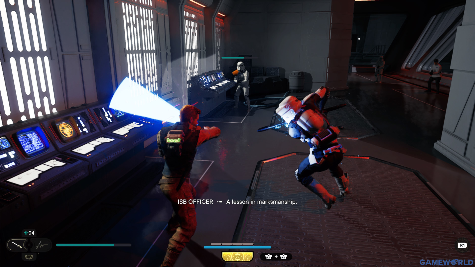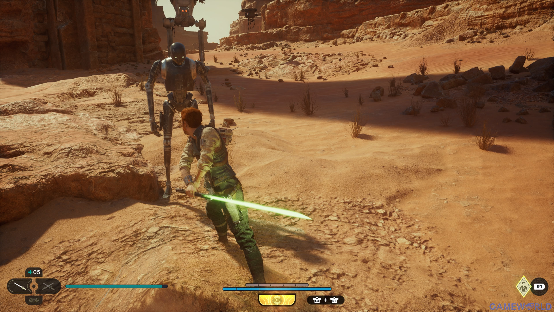 Βασικό όπλο σας παραμένει το φωτόσπαθο, για το οποίο πλέον θα μπορείτε να διαλέξετε ανάμεσα σε 5 διαφορετικά stances. Το Single είναι το κλασσικό, με το οποίο παίξαμε και σχεδόν όλο το Fallen Order και αποτελεί ίσως την πιο safe επιλογή. Το Dual Wield σας επιτρέπει να έχετε δύο φωτόσπαθα σε κάθε χέρι, αλλά με λίγο πιο αδύναμες επιθέσεις. Με το Blaster, όπως λέει και το όνομά του, έχετε πέρα από το φωτόσπαθο και ένα πιστόλι blaster για μακρινές επιθέσεις. Οι σφαίρες που έχει είναι περιορισμένες κάθε φορά, όμως αναπληρώνονται με κάθε επιτυχημένη επίθεση που κάνετε με το φωτόσπαθο. Στη συνέχεια έχουμε το Double-Bladed με το οποίο το φωτόσπαθο έχει λεπίδα και στην πάνω μεριά και στην κάτω. Το συγκεκριμένο κάνει αρκετά γρήγορες επιθέσεις και σε πολλούς εχθρούς ταυτόχρονα. Τέλος έχουμε το Crossguard, στο οποίο το φωτόσπαθο μεγαλώνει αρκετά σε μέγεθος με αποτέλεσμα ο Cal να το κρατάει και με τα δύο χέρια. Το Crossguard κάνει το πιο πολύ damage ανά χτύπημα αλλά οι επιθέσεις σας είναι αρκετά πιο αργές και χρειάζεται συνήθεια για να είναι αποτελεσματικό.