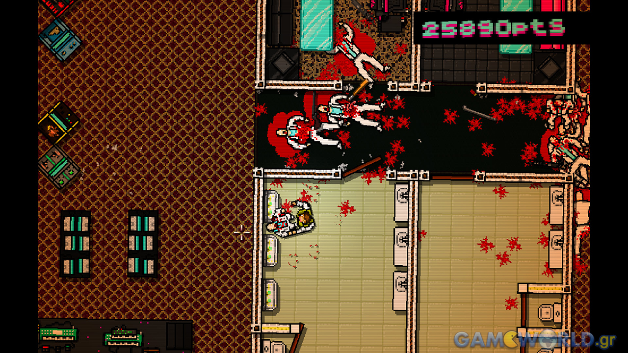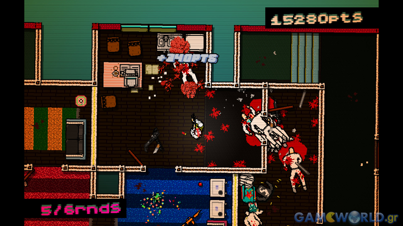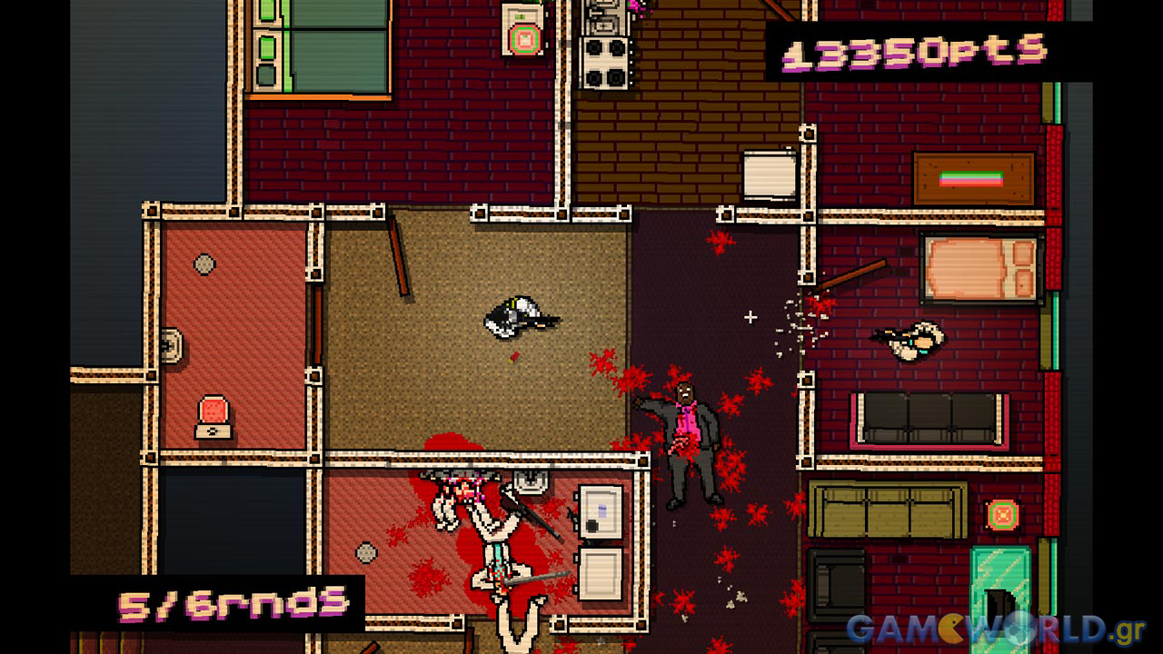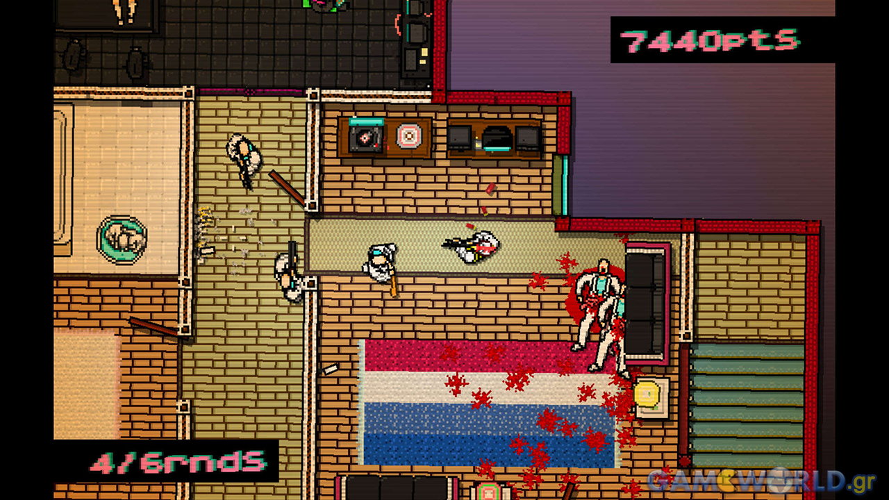 Το Hotline Miami λοιπόν, μπορεί επίσης να μην ανακαλύπτει κάποιο νέο είδος, αλλά καταφέρνει να προσφέρει ένα τόσο απολαυστικό gameplay που μπορεί στην αρχή να μην το εκτιμήσετε, αλλά όσο παίζετε θα σας προκαλέσει έναν εθισμό που προσωπικά μου θύμισε εποχές ουφάδικου! Αυτό νομίζω οφείλεται κυρίως στην πολύ απλή ιδέα ότι ο Jacket δεν έχει health bar ή αντοχή ή regeneration και αν φάει μία σφαίρα ή μία μαχαιριά ή οτιδήποτε πεθαίνει, όπως άλλωστε και οι αντίπαλοί του. Όλα λοιπόν κρίνονται σε κλάσματα δευτερολέπτου και η γραμμή μεταξύ του να σκοτώσετε ή να σας σκοτώσουν ποτέ δεν ήταν λεπτότερη. Φυσικά αν χάσετε, πατάτε ένα κουμπί και ξεκινάτε αμέσως από την αρχή (υπάρχουν κάποια στοιχειώδη checkpoints όταν αλλάζετε όροφο), κάτι που σας κρατάει σε μια συνεχή εγρήγορση.